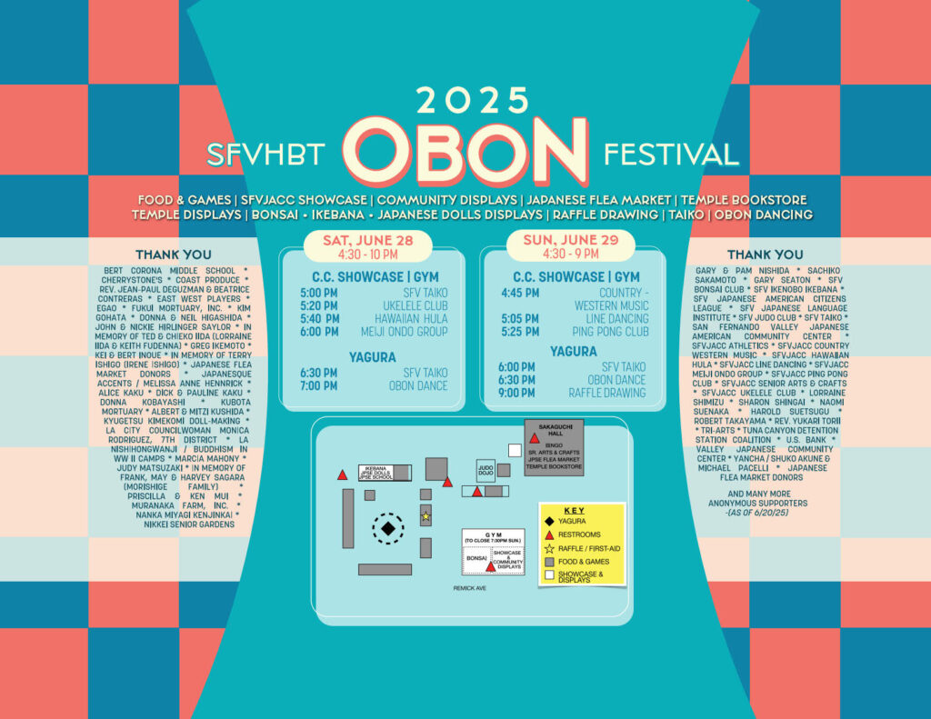 Obon Festival now features demonstrations by SFV Japanese American Community Center Clubs. Visit the gym and dojo to watch our talented community perform, and then head to the yagura for taiko and obon dancing.