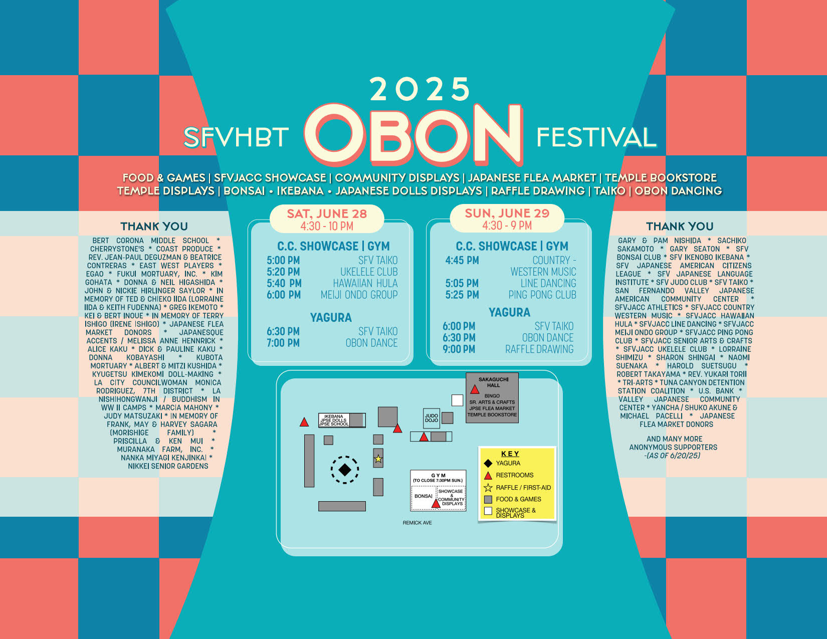 *SFVJACC SHOWCASE * TAIKO PERFORMANCES * BONSAI EXHIBIT * JAPANESE DOLL MAKING EXHIBIT * JAPANESE FLEA MARKET *TEMPLE BOOKSTORE * BUDDHISM IN WWII DISPLAY * SENIOR ARTS & CRAFTS *COMMUNITY NON-PROFIT DISPLAYS/TABLES * FAMILY-FRIENDLY GAMES *RAFFLE DRAWING * DELICIOUS FOOD AND DRINK * OBON ODORI DANCING *
